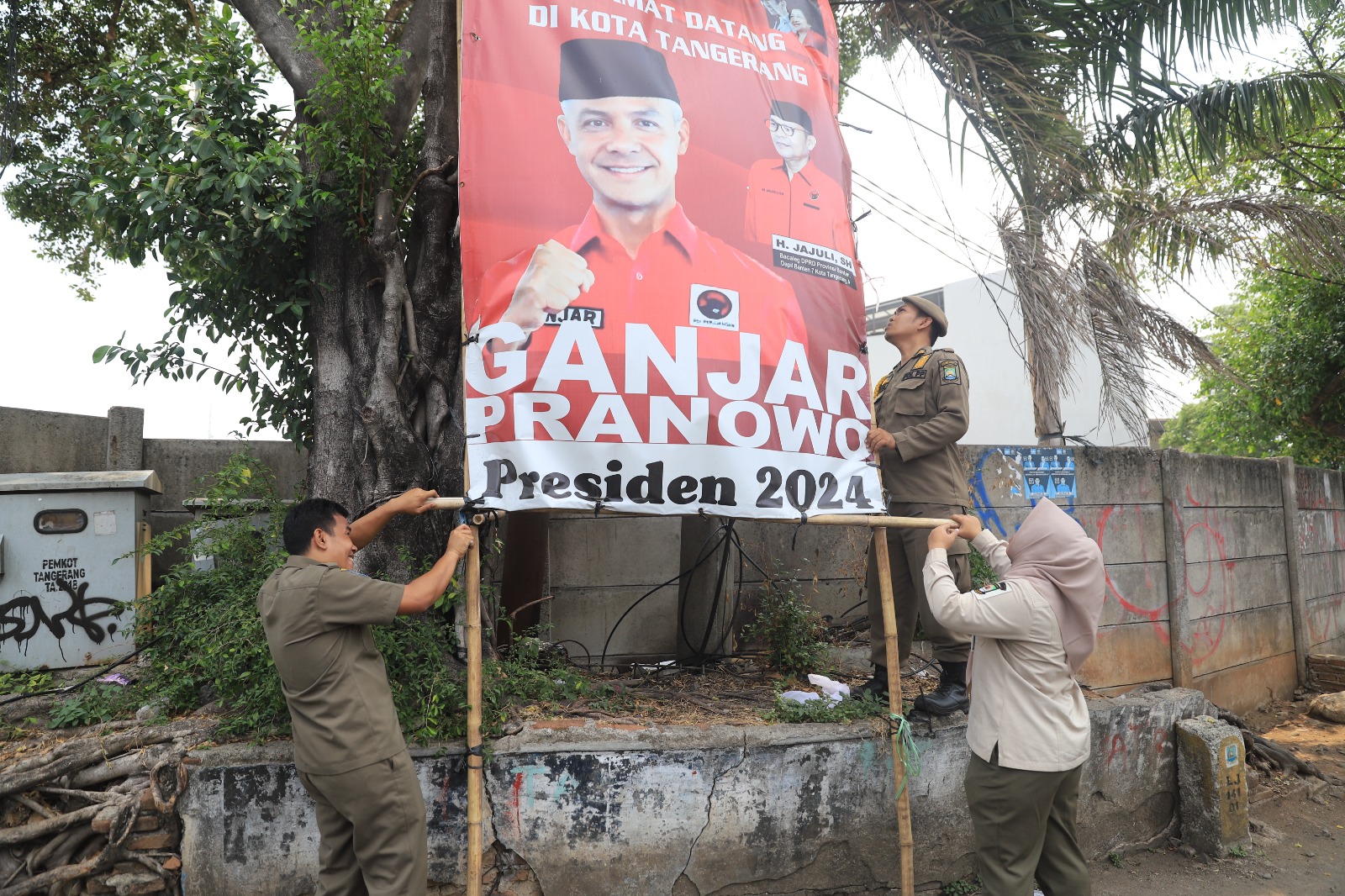 Menjaga keindahan dan kebersihan ruang-ruang publik di Kota Tangerang. Pemerintah Kota (Pemkot) Tangerang melalui Satuan Polisi Pamong Praja (Satpol PP) Kota Tangerang melakukan giat penertiban Pedagang Kaki Lima (PKL) hingga spanduk atau baliho liar yang tersebar di berbagai area strategis, Rabu 18 Oktober 2023. Foto : HO/Lensabanten