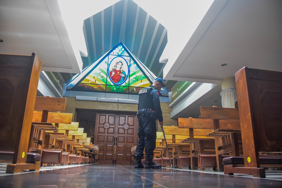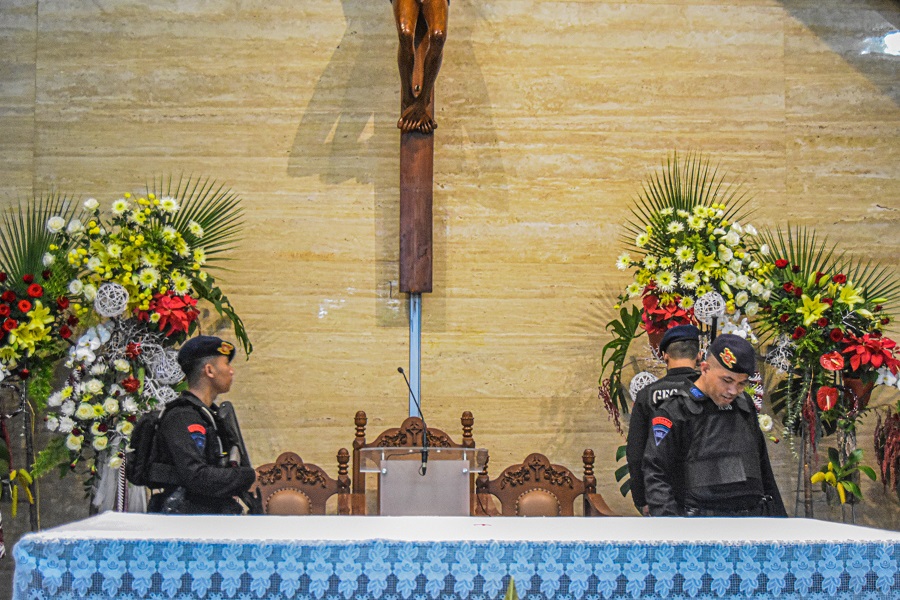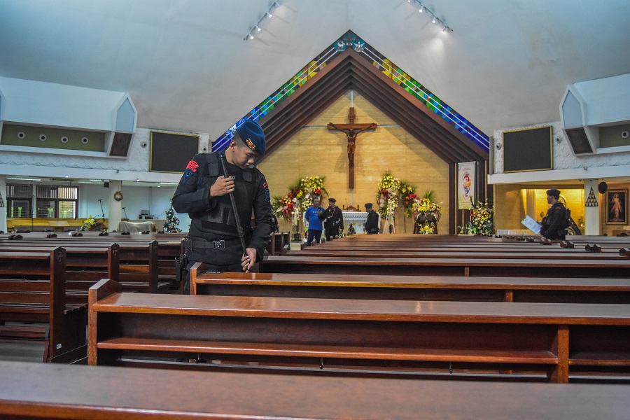 Personil Gegana Polda Metro Jaya melakukan sterilisasi di Gereja Hati Santa Perawan Maria Tak Bernoda, Kota Tangerang, Banten, Selasa (24/12/2024). Tim Gegana Polda Metro Jaya Mensterilisasi sejumlah gereja yang akan digunakan untuk perayaan natal guna menjamin keamanan dan kenyamanan bagi umat kristiani dalam beribadah terutama saat Natal 2024. Foto : Ilham Herda Fauzi/LENSABANTEN