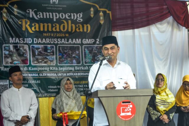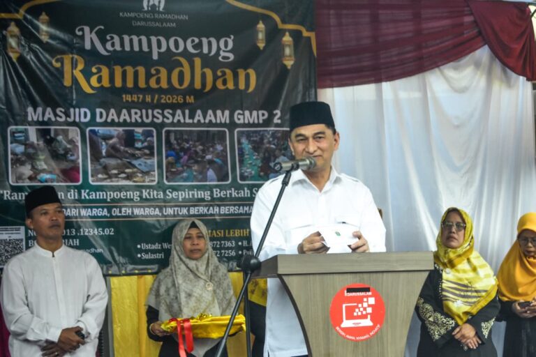 Wakil Gubernur Banten Dimyati Natakusumah menggunting pita dalam pembukaan Kampoeng Ramadhan di Perumahan Graha Graha Mutiara Permai 2, Kabupaten Tangerang, Banten, Senin (23/02/2026). Kegiatan yang diselenggarakan oleh warga perumahan tersebut menyiapkan sebanyak 700 porsi hidangan buka puasa gratis selama 22 hari bulan suci Ramadhan 1447 Hijriah untuk pengendara yang dalam perjalanan dan warga kurang mampu. Foto: Ilham Herda Fauzi/LENSA BANTEN