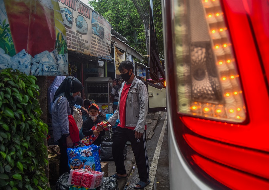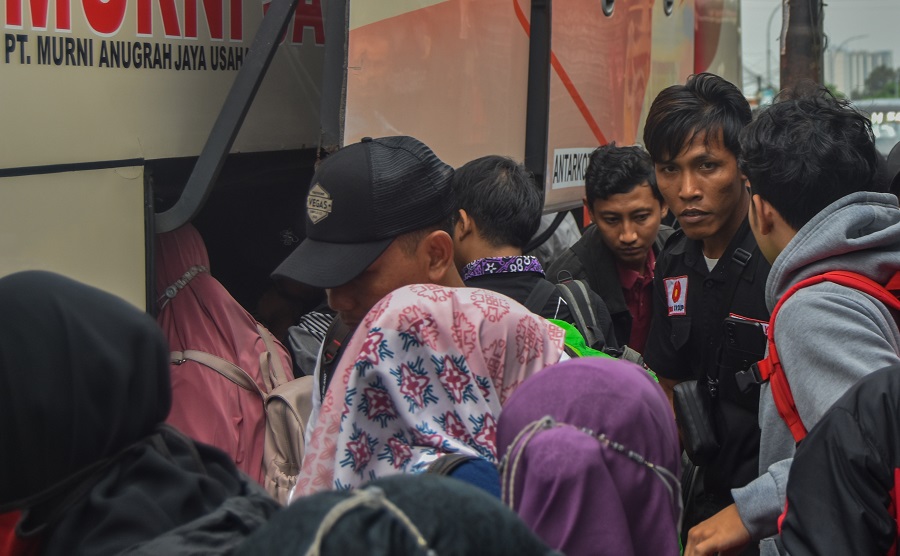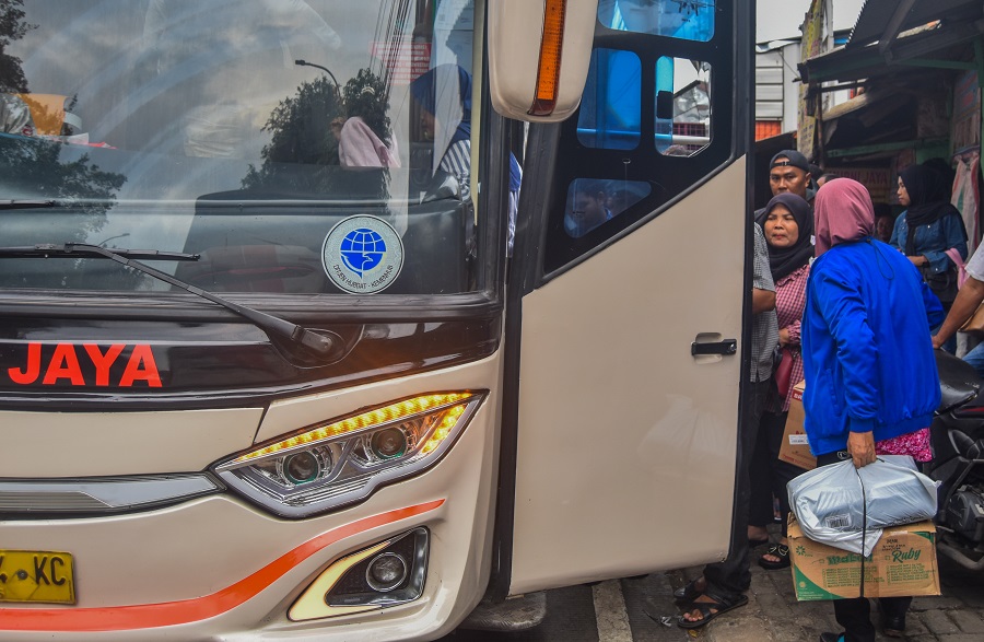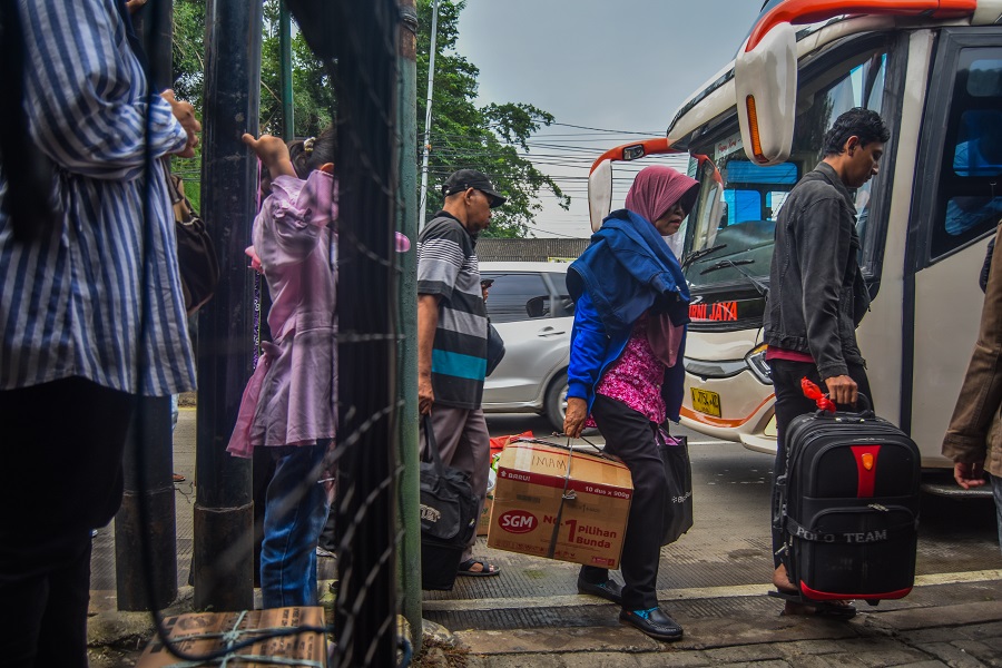 Pemudik berangkat pulang kampun melalui agen jual beli tiket bus di Jalan Gatot Subroto, Jatiuwung, Kota Tangerang, Banten, Jumat (05/04/2024). Menjelang Lebaran IdulFitri tahun 2024 Tiket Bus terjadi kenaikan harga yang cukup tinggi dengan kenaikan 100%, harga biasanya Rp200.000 mendekati lebaran menyampai Rp400.000. Foto : Ilhamd Hedra Fauzi/LENSABANTEN