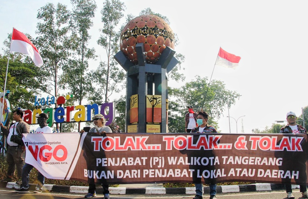 Belasan orang yang mengatasnamakan Forum Non Goverment Organitation (NGO) Tangerang Raya melakukan aksi unjuk rasa di bundaran Tugu Adipura, Kota Tangerang, Senin (16/10). Massa aksi membawa berbagai spanduk dan bendera menuntut, menolak Penjabat (Pj) Wali Kota Tangerang dari luar yang bakal ditunjuk Kemendagri. Foto : HO/Lensabanten