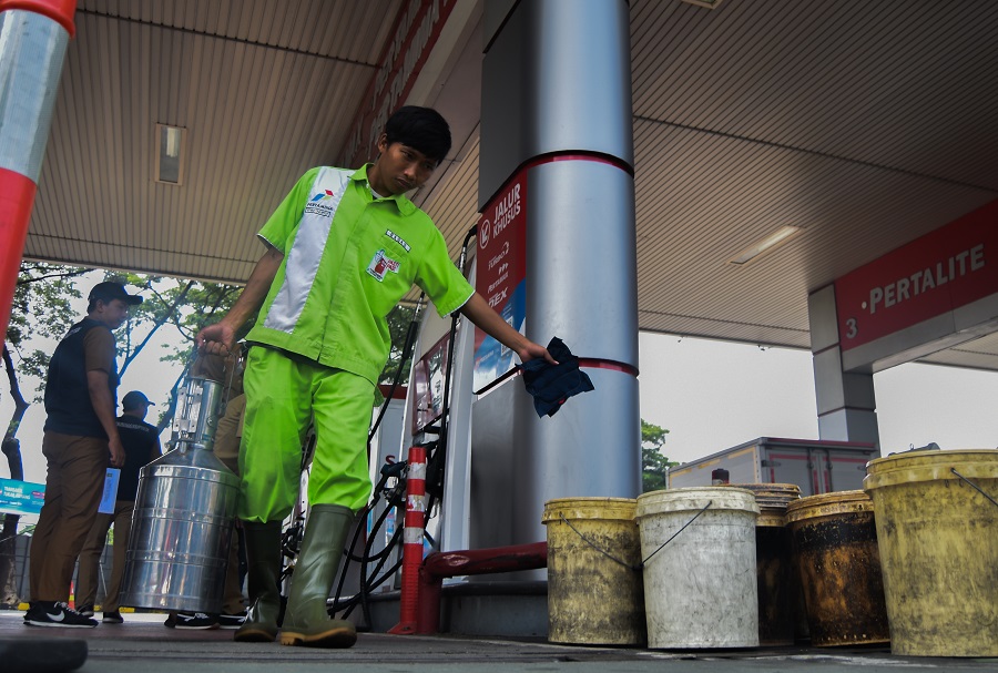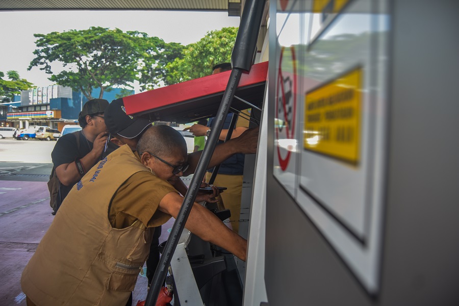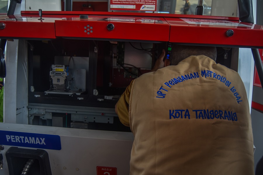 Dinas Perindustrian dan Perdagangan Kota Tangerang dan UPT Meteorologi legal mengadakan Uji Tera di Tol Jakarta Tangerang, Pom Bensin Rest Area Pinang Point Km 14, Kota Tangerang, Banten, Senin (01/04/2024). Uji Tera ini dilakukan di 3 titik yang di lewati para pemudik, seperti Rest Area Pinang Point Km 14, SPBU Daan Mogot, dan SPBU Jatiuwung tujuannya agar para pemudik nyaman selama pengisian bahan bakar kendaraan. Foto : Ilham Hedra Fauzi/LENSABANTEN