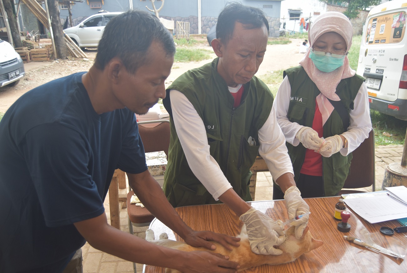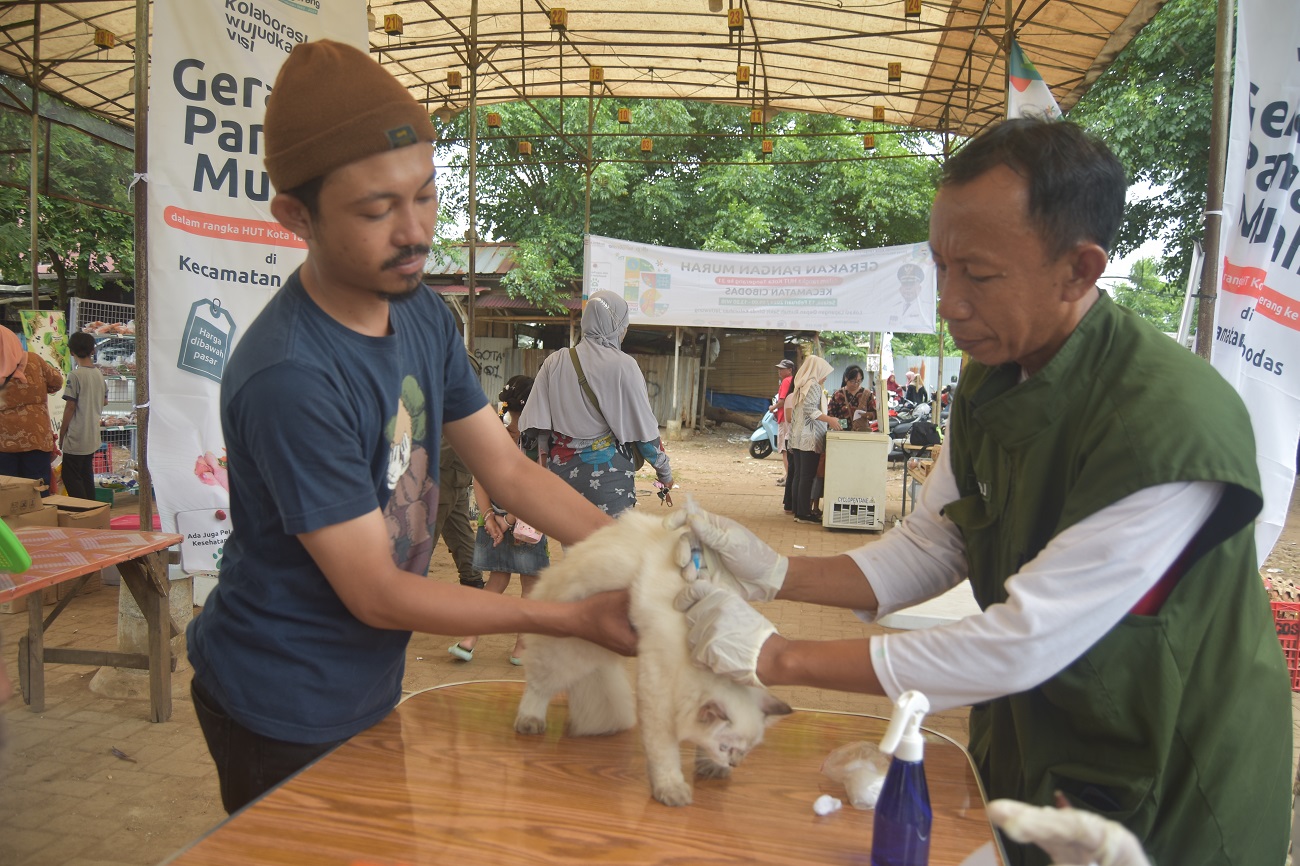 Dokter hewan menyuntikan vaksin pada kucing yang dibawa warga, di lapangan depan RS Dinda, Kelurahan Jatiuwung, Kecamatan Cibodas, Kota Tangerang, Banten, Jumat (23/02/2024). Dalam rangka HUT Kota Tangerang ke 31 Tahun Pemerintahan Kota Tangerang melalui UPTD Puskeswan DKP Kota Tangerang mengadakan cek Kesehatan dan vaksin gratis untuk hewan peliharan yang di setiap 13 Kecamatan Kota Tangerang. Foto : Ilham Herda Fauzi/LENSABANTEN