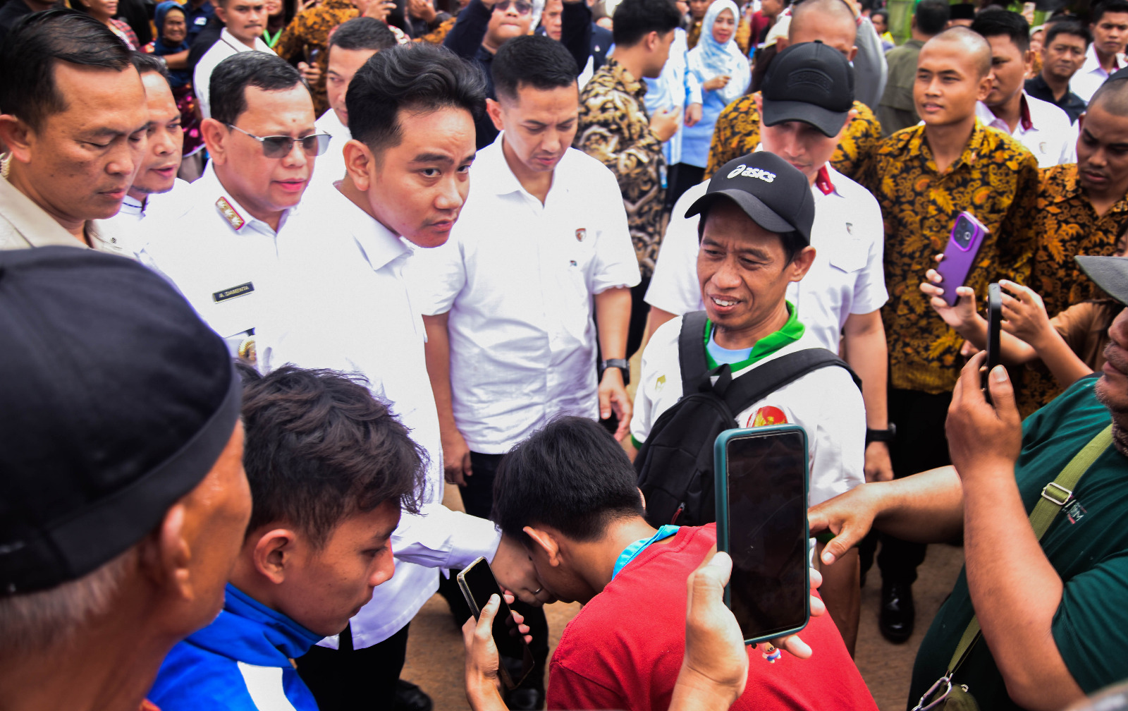 Wakil Presiden Gibran Rakabuming Raka (Tengah) meninjau pembangunan Pasar Anyar, Kota Tangerang, Banten, Jumat (24/01/2025). Kondisi gedung Pasar Anyar saat ini telah masuk tahap finishing dalam revitalisasi dengan tiga lantai dan ketersediaan kios atau los sebanyak 1.672 unit, ditargetkan rampung pada bulan depan. Gibran dalam kunjungannya ini menyempatkan juga menyapa para pedagang yang berada di depan gedung pasar Anyar. Foto : Ilham Herda Fauzi/LENSABANTEN