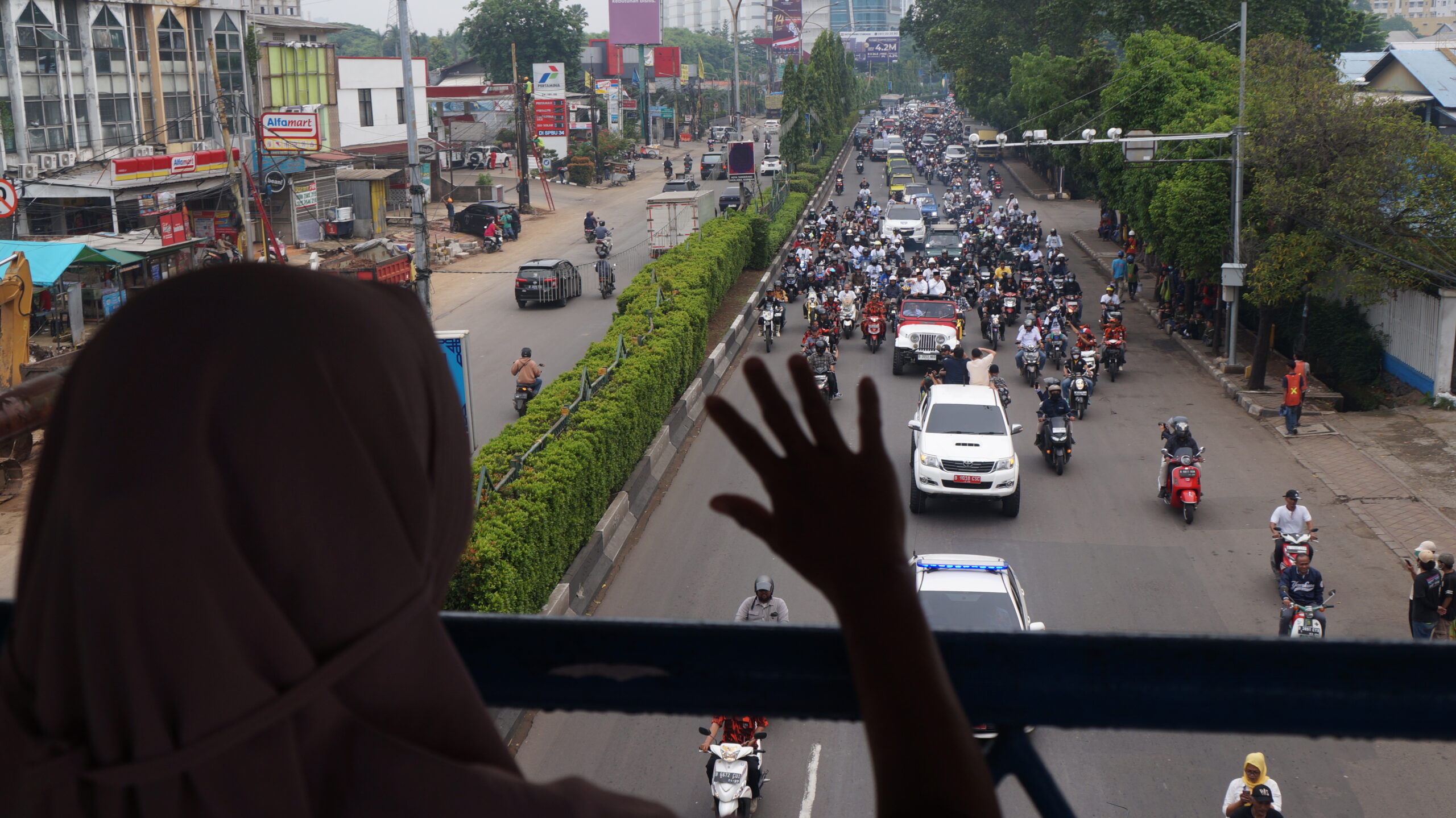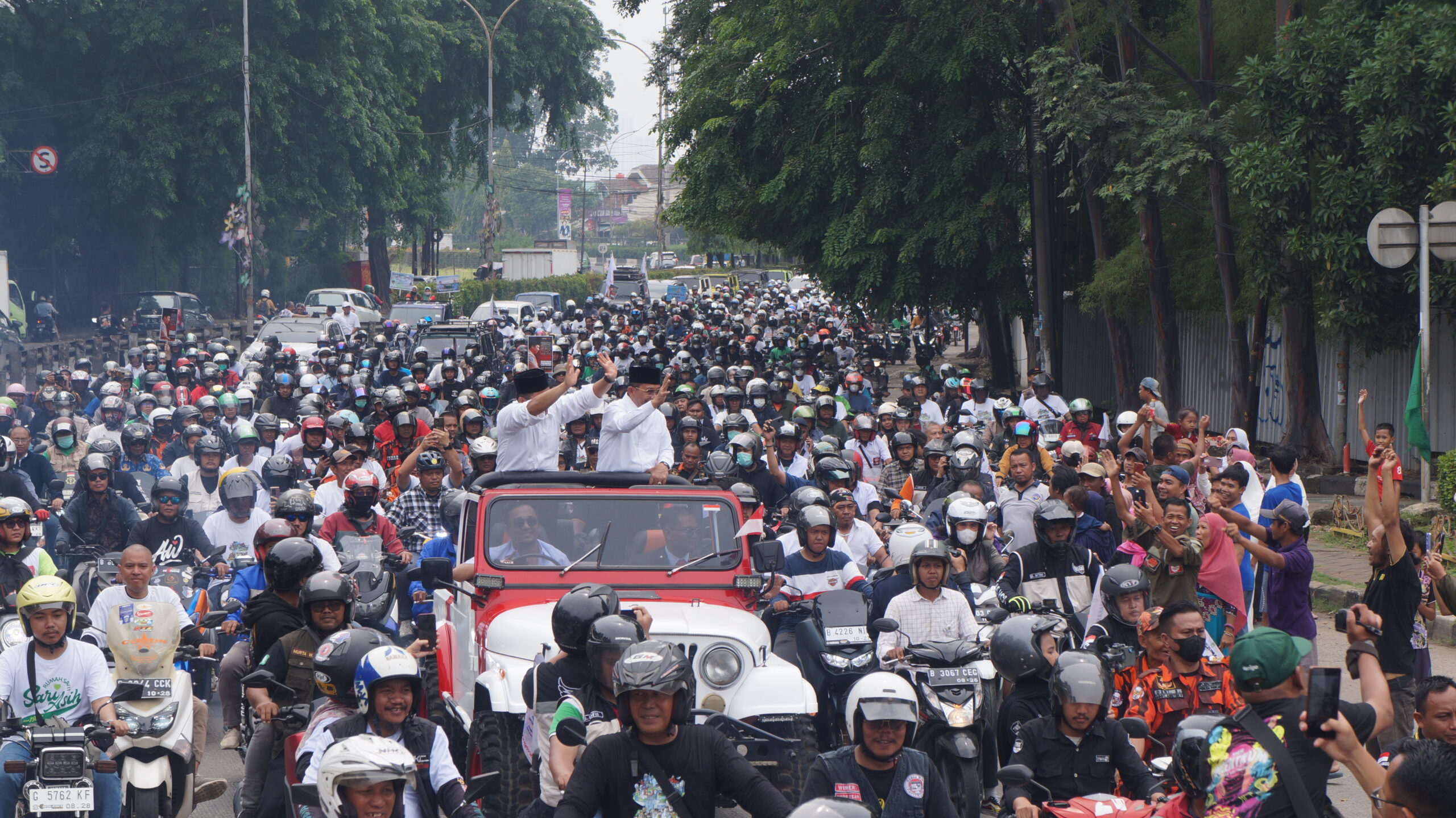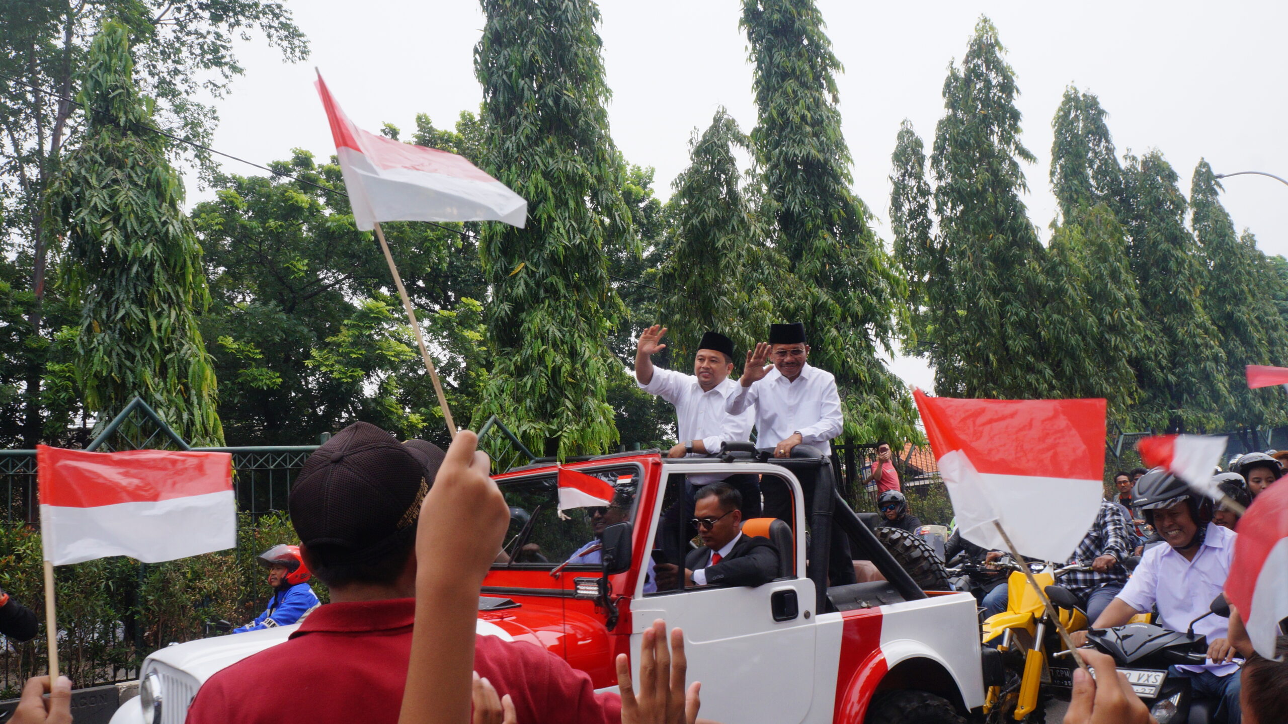 Wali Kota Tangerang Arief R. Wismansyah bersama Wakil Wali Kota Sachrudin periode 2018-2023 diatas mobil melambaikan tangan ke warga yang menyambutnya, Kota Tangerang, Selasa 26 Desember 2023. Keduanya per Selasa 26 Desember 2023 resmi menuntaskan jabatannya karena sudah purna tugas sebagai Wali Kota dan Wakil Wali Kota Tangerang. FOTO : Eky Fajrin/Lensabanten