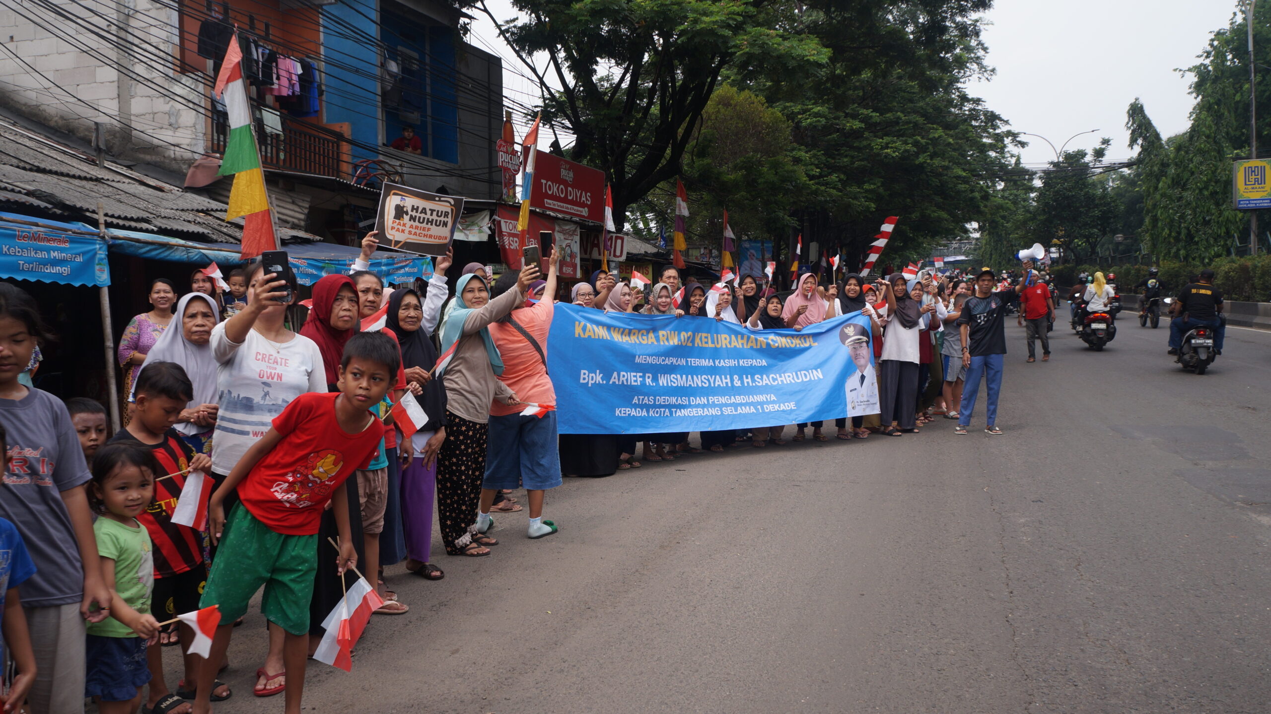 Warga menyambut rombongan Wali Kota Arief dan Wakil Wali Kota Tangerang Sachrudin saat melintas di Jl.MH.Thamrin, Cikokol. Foto : Eky
