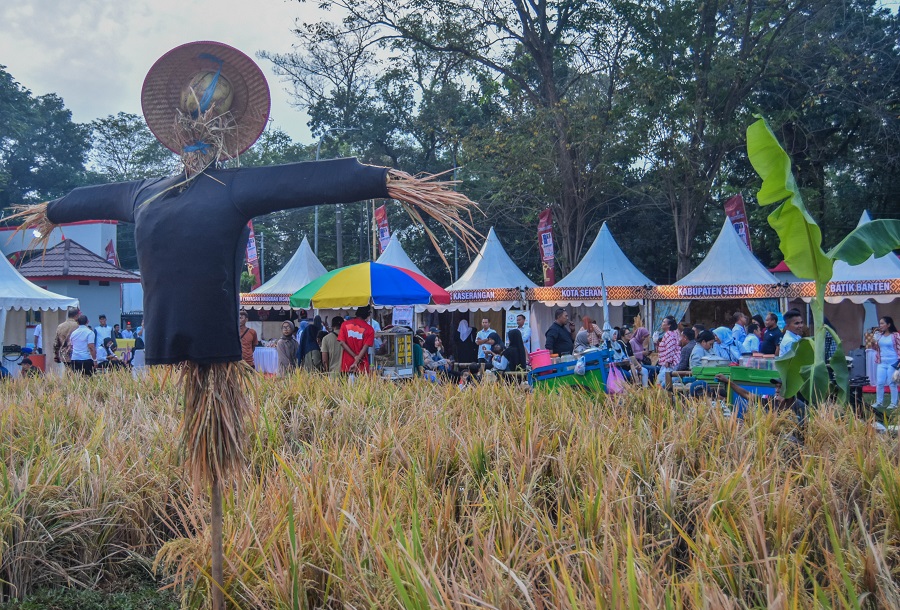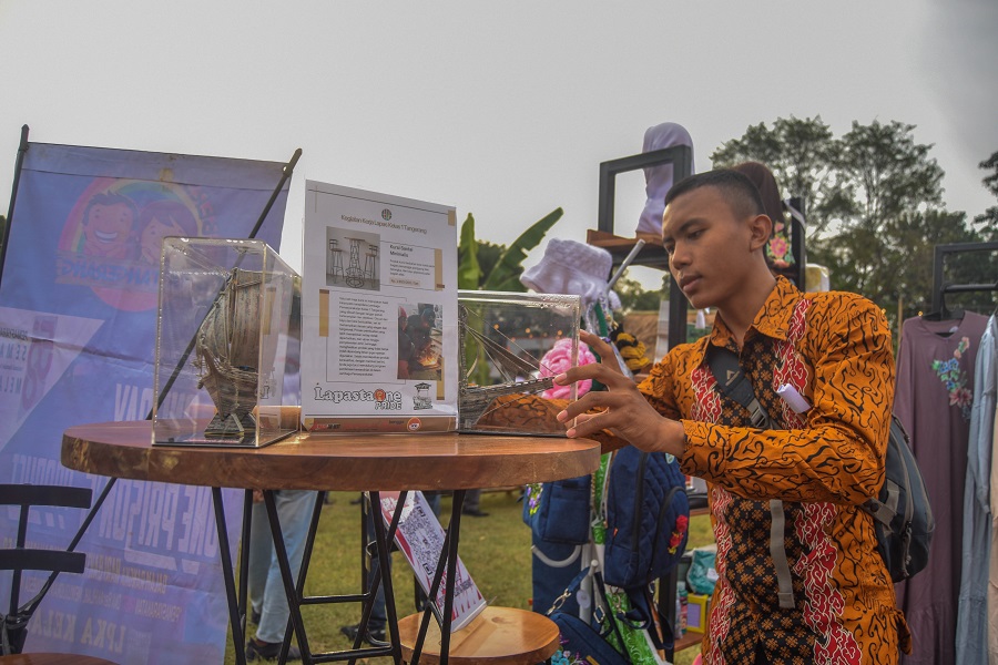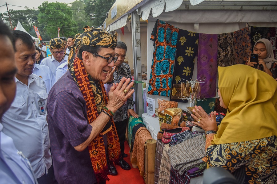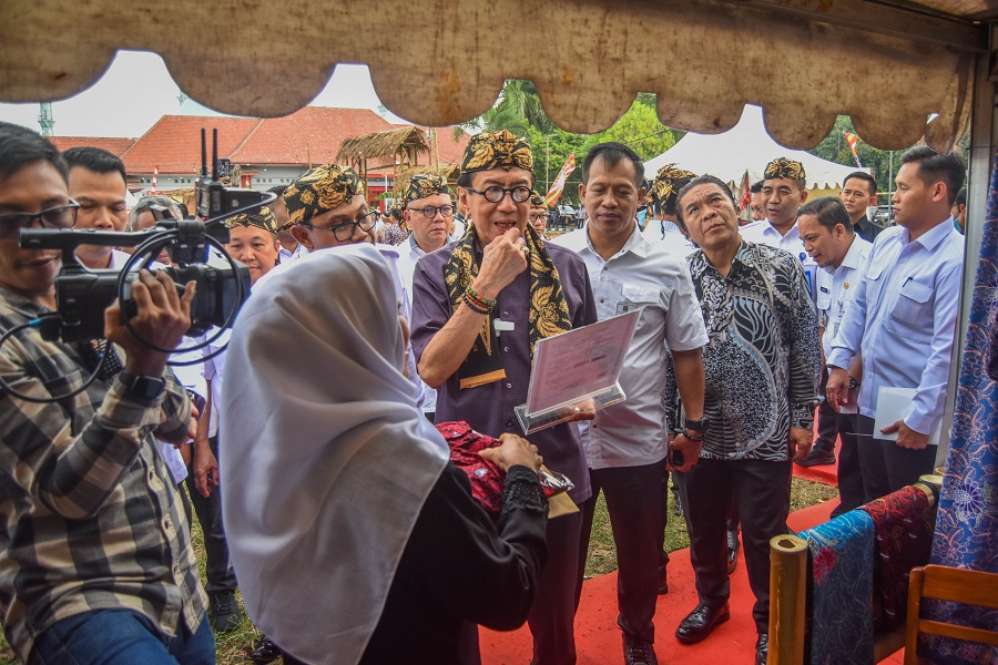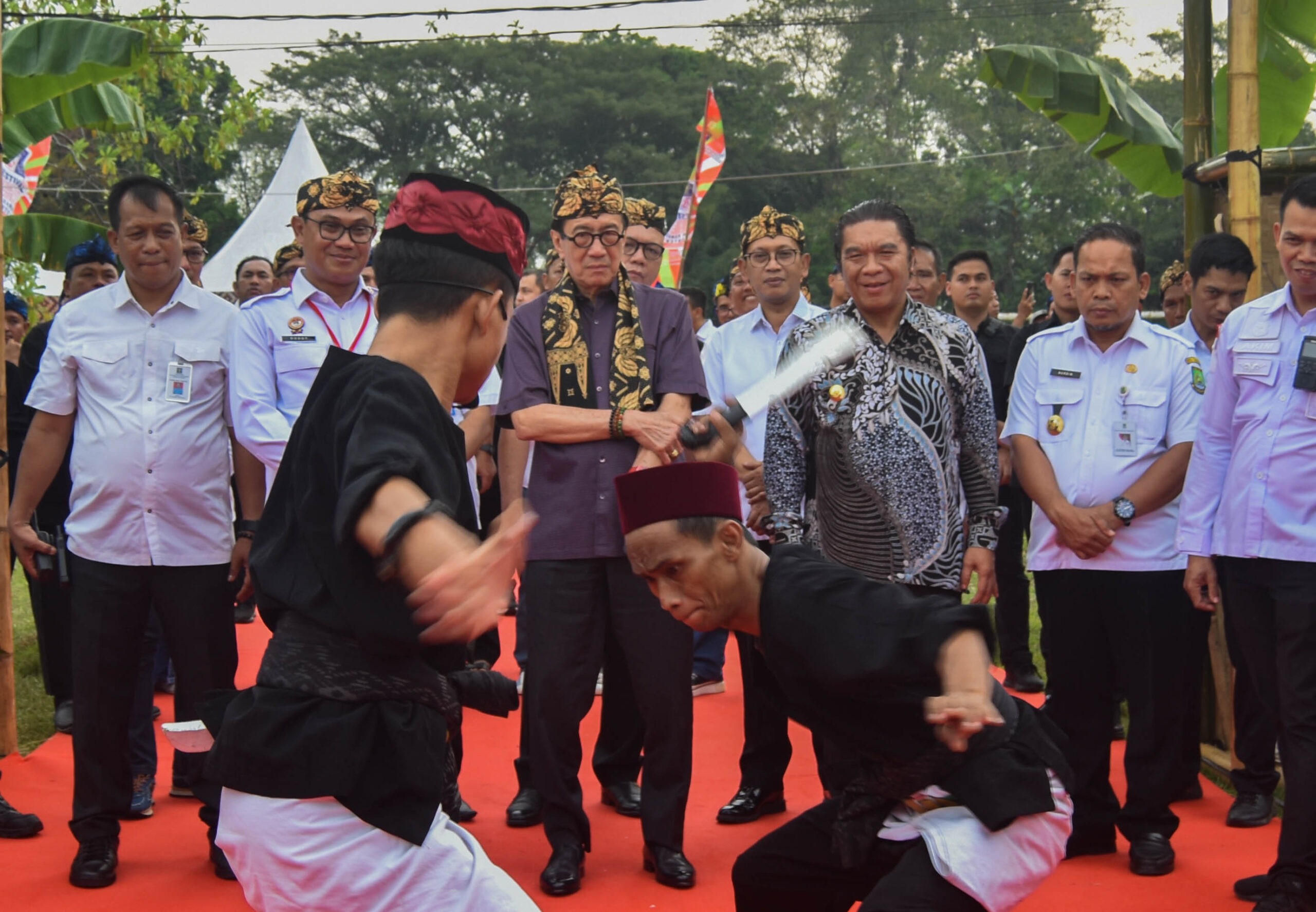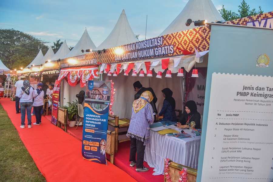 Menteri Hukum dan HAM Yasonna Laoly mengunjungi stand UMKM dalam Festival Layanan Hukum dan HAM di lapangan Lembaga Pembinaan Khusus Anak (LPKA) Kelas 1 Kota Tangerang, Banten, Rabu (07/08/2024). Kantor Wilayah Layanan Hukum dan HAM (Kanwil Kemenkumham) menggelar Festival Layanan Hukum dan HAM dalam rangka memperingati Hari Pengayoman ke- 79 Tahun 2024, yang menghadirkan berbagai jenis layanan Kemenkumham dalam satu tempat dan satu waktu (one stop service) serta UMKM se-Provinsi Banten. Foto : Ilham Herda Fauzi/LENSABANTEN