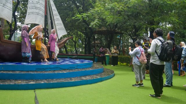 Pegiat fotografi memotret model saat parade Hari Batik Nasional di Taman Potret, Kota Tangerang, Banten, […]