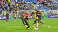 Pesepak bola Persikota Tangerang Dohyun Kim (baju Kuning) membawa bola dan dihadang dengan pemain Sriwijaya FC pada […]