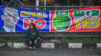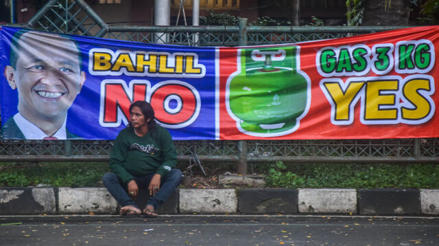 Seorang warga berduduk santai di depan spanduk bertuliskan Bahlil No, Gas 3 Kg Yes di […]