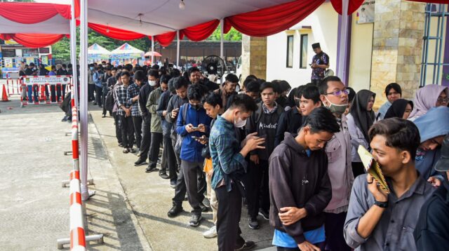Sejumlah pencari kerja antre untuk mencari informasi lowongan kerja dalam bursa lowongan kerja Naker Fast […]