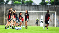 Pesepak bola Timnas Putri Indonesia Safira Ika (tengah) mencoba melewati pemain lainnya saat mengikuti pemusatan […]