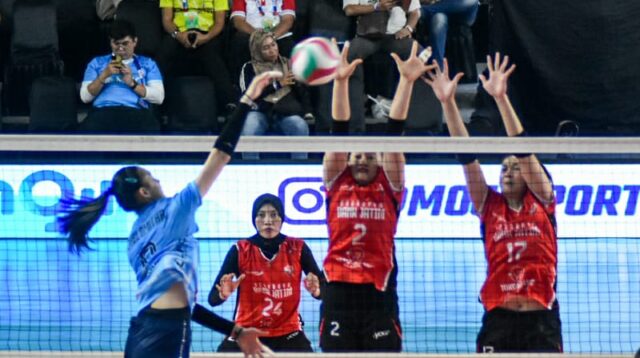 Pevoli Syelomitha (kiri) melakukan smes yang berusaha dihalau pevoli Vara (tengah) dan Maya Indri (kanan) saat […]