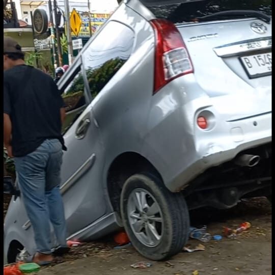 Katanya, kecelakaan tersebut terjadi saat mobil ingin menyalip dari sisi kanan, namun nahas nya mobil menyeret sebuah motor yang ada di arah yang sama, lalu terperosok kesebuah kali sipon.