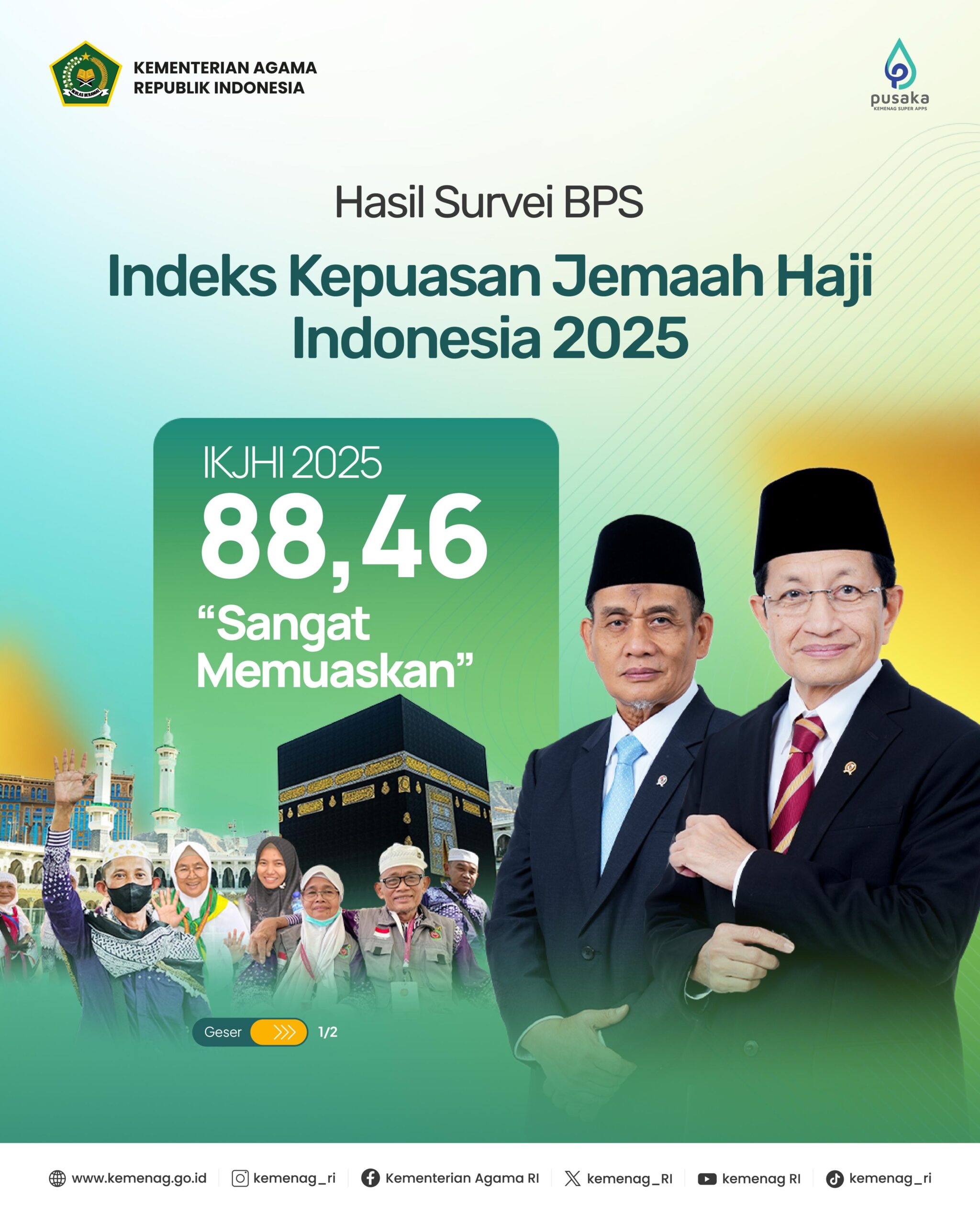 “Alhamdulillah hari ini kita sudah mendengar bersama, bahwa Indeks Kepuasan Jemaah Haji Indonesia 2025 mencapai angka 88,46. Angka ini lebih tinggi dibanding tahun sebelumnya, yakni 88,20. Kita semua patut bersyukur atas capaian ini,” papar Menteri Agama Nasaruddin Umar di Jakarta, Rabu 10 September 2025.