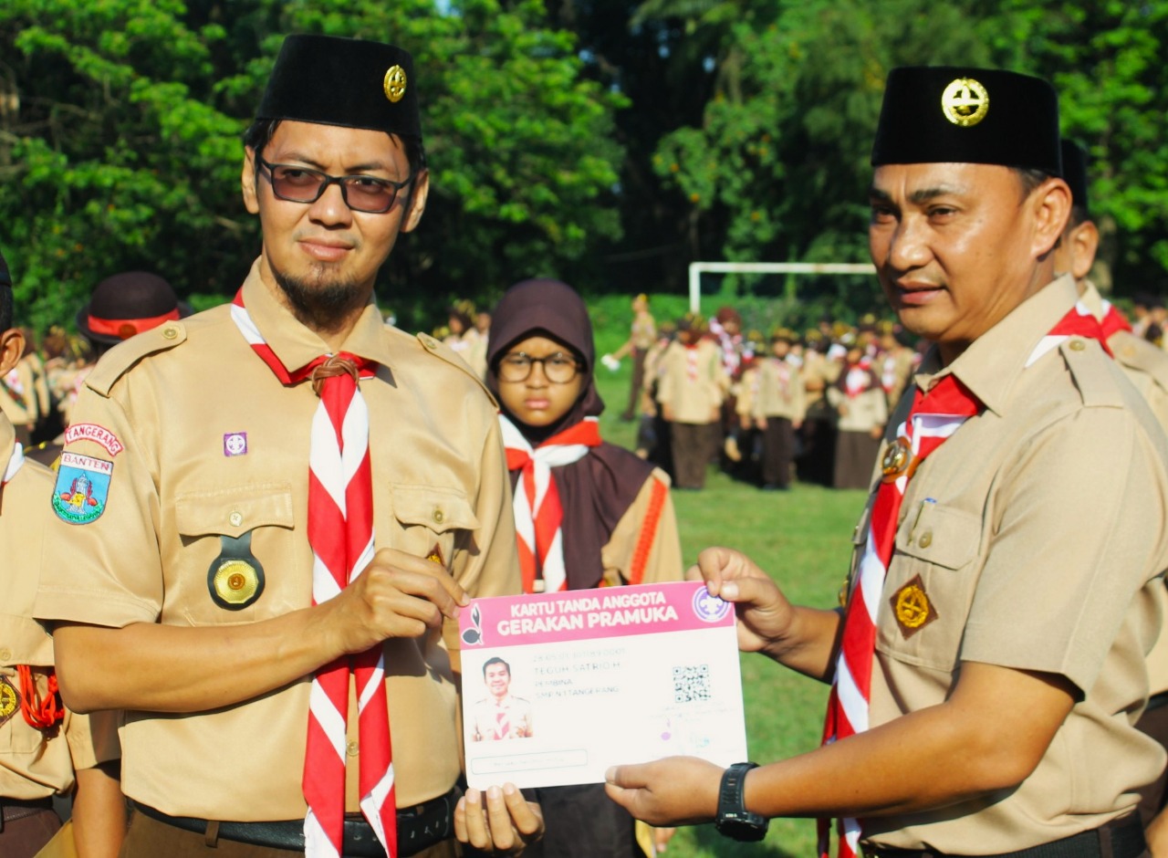 KOTA TANGERANG, LENSABANTEN. CO. ID –Camat Tangerang Yudi Pradana selaku Ketua Majelis Pembimbing Gerakan Pramuka Kwartir Ranting Tangerang memberikan secara simbolis Kartu Tanda Anggota (KTA) kepada perwakilan Gugusdepan saat upacara Hari Pramuka ke 64, di Lapangan Lembaga Pembinaan Khusus Anak (LPKA) Kelas 1 Tangerang, Jalan Daan Mogot Raya, Kota Tangerang, Sabtu 30 Agustus 2025.