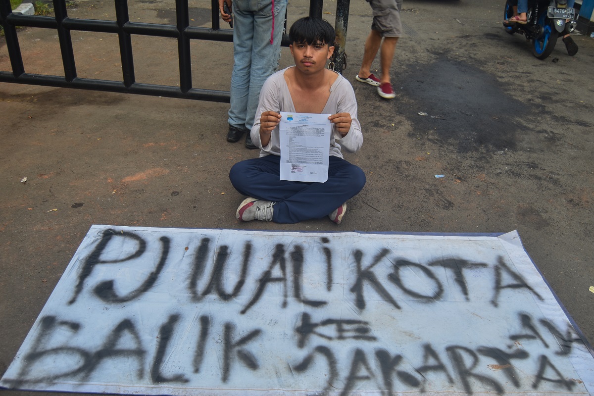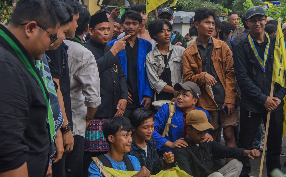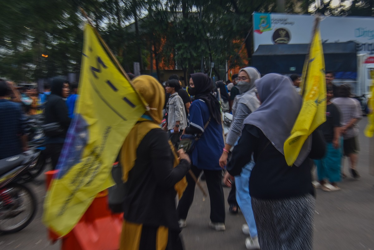 Puluhan Mahasiswa aliansi Himpunan mahasiswa Islam (HMI) dan Pergerakan Mahasiswa Islam Indonesia (PMII) menyampaikan aspirasi di depan pintu gedung Pusat Pemerintahan Kota Tangerang, Banten, Rabu (28/02/2024). Pada momen HUT Kota Tangerang ke 31 Tahun mereka menyampaikan 8 tuntutan salah satunya mendesak anggota DPRD Kota Tangerang untuk membatalkan belanja sewa kendaraan roda empat di masa harga bahan pokok sedang meningkat. Foto : Ilham Herda Fauzi/LENSABANTEN