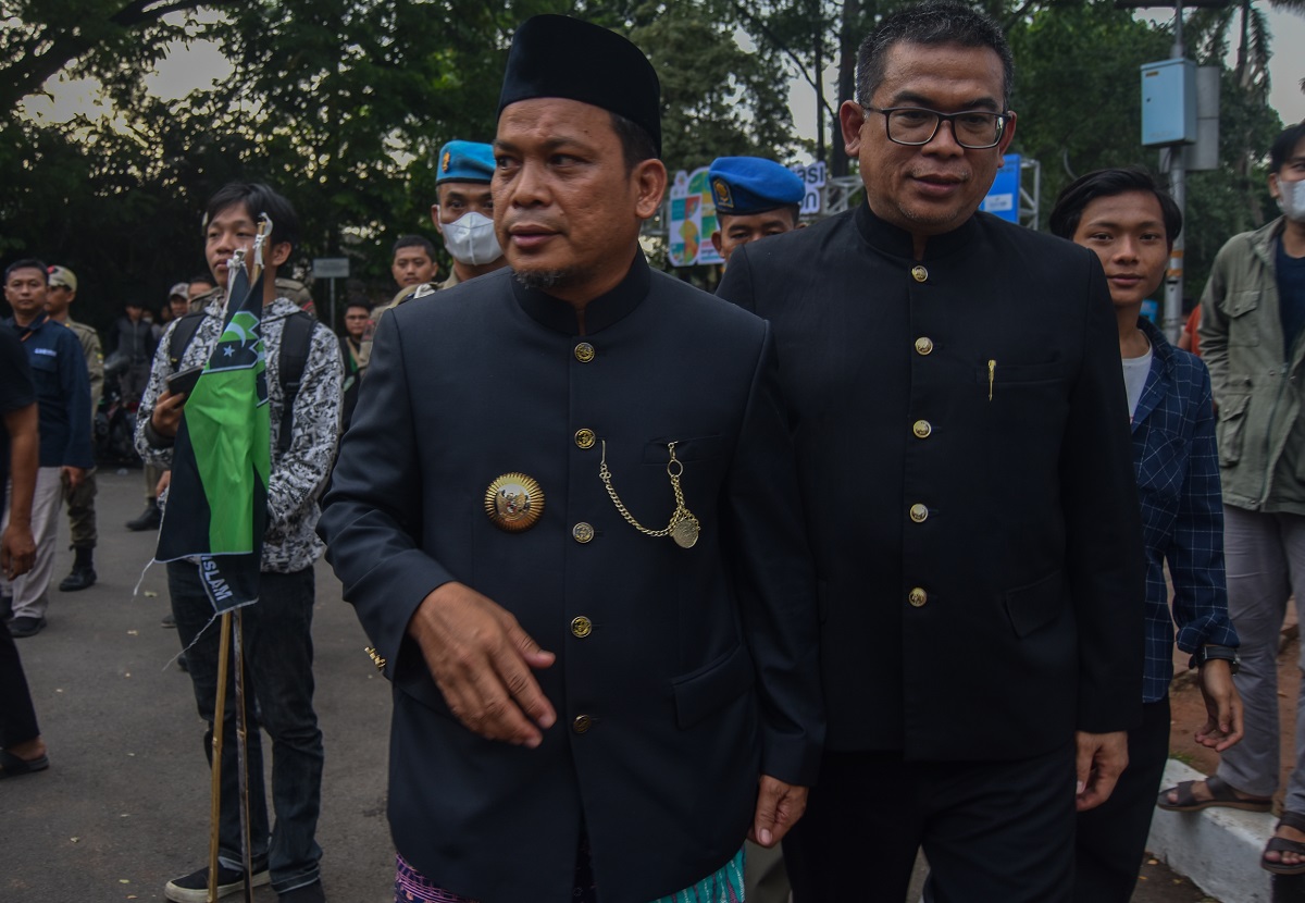 Pj Wali Kota Tangerang Dr. Nurdin (kiri) di dampingi Kasatpol PP Wawan Fauzi usai menemui Mahasiswa aliansi Himpunan mahasiswa Islam (HMI) dan Pergerakan Mahasiswa Islam Indonesia (PMII) yang unjuk rasa di depan pintu gedung Pusat Pemerintahan Kota Tangerang, Banten, Rabu (28/02/2024). Pada momen HUT Kota Tangerang ke 31 Tahun mereka menyampaikan 8 tuntutan salah satunya mendesak anggota DPRD Kota Tangerang untuk membatalkan belanja sewa kendaraan roda empat di masa harga bahan pokok sedang meningkat. Foto : Ilham Herda Fauzi/LENSABANTEN