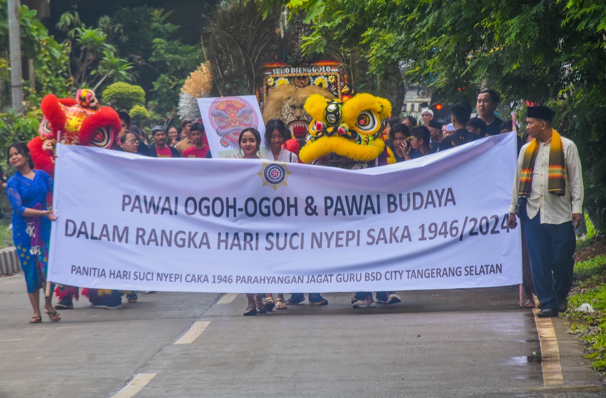 Sejumlah anak muda menggotong patung ogoh-ogoh di acara memperingati hari raya nyepi tahun saka 1946 di Jln. Ambon, Nusa loka Sektor XVI, BSD City, Kota Tangerang Selatan, Banten, Minggu (10/03/2024). Pure Parayangan Jagat Guru mengadakan Pawai Ogoh-ogoh dan Pawai Budaya dalam rangka memperingati Hari Suci Nyepi Saka 1964/2024. Acara ini di ramaikan dengan ogoh-ogoh, ondel-ondel, barongsai, dan reog ponorogo. Foto : Ilham Hedra Fauzi/LENSABANTEN