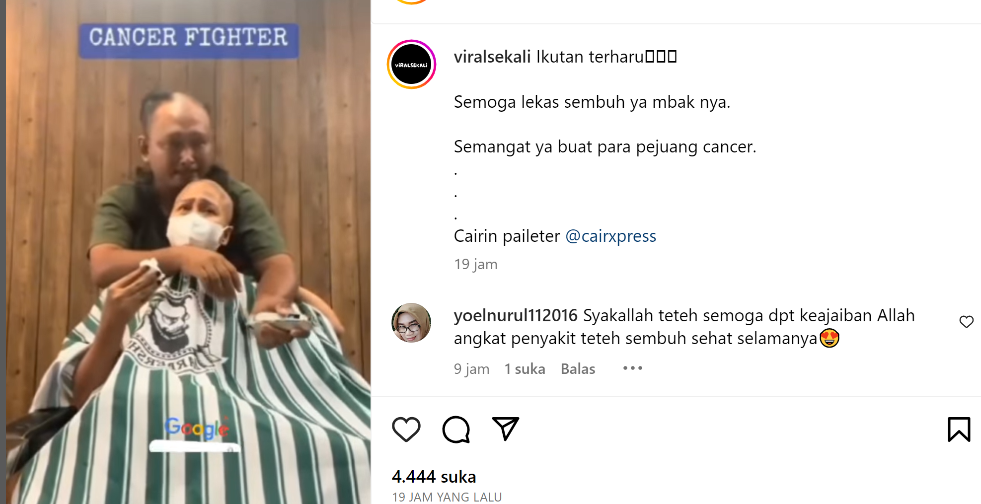 Video yang di unggah oleh akun instagram Viralsekali ini membuat haru penonton yang melihatnya karena di dapat informasi, suami nya menggunduli rambut istrinya guna berjuang menghadapi penyakir kanker yang dideritanya.