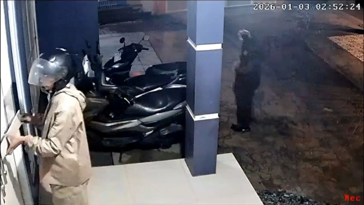 Dalam rekaman CCTV terlihat dua orang pelaku mengenakan jas hujan dan helm. Salah satu pelaku diduga menahan pintu rumah dengan keramik, sementara pelaku lainnya membobol kunci setang sepeda motor korban hingga berhasil membawa kabur kendaraan tersebut.