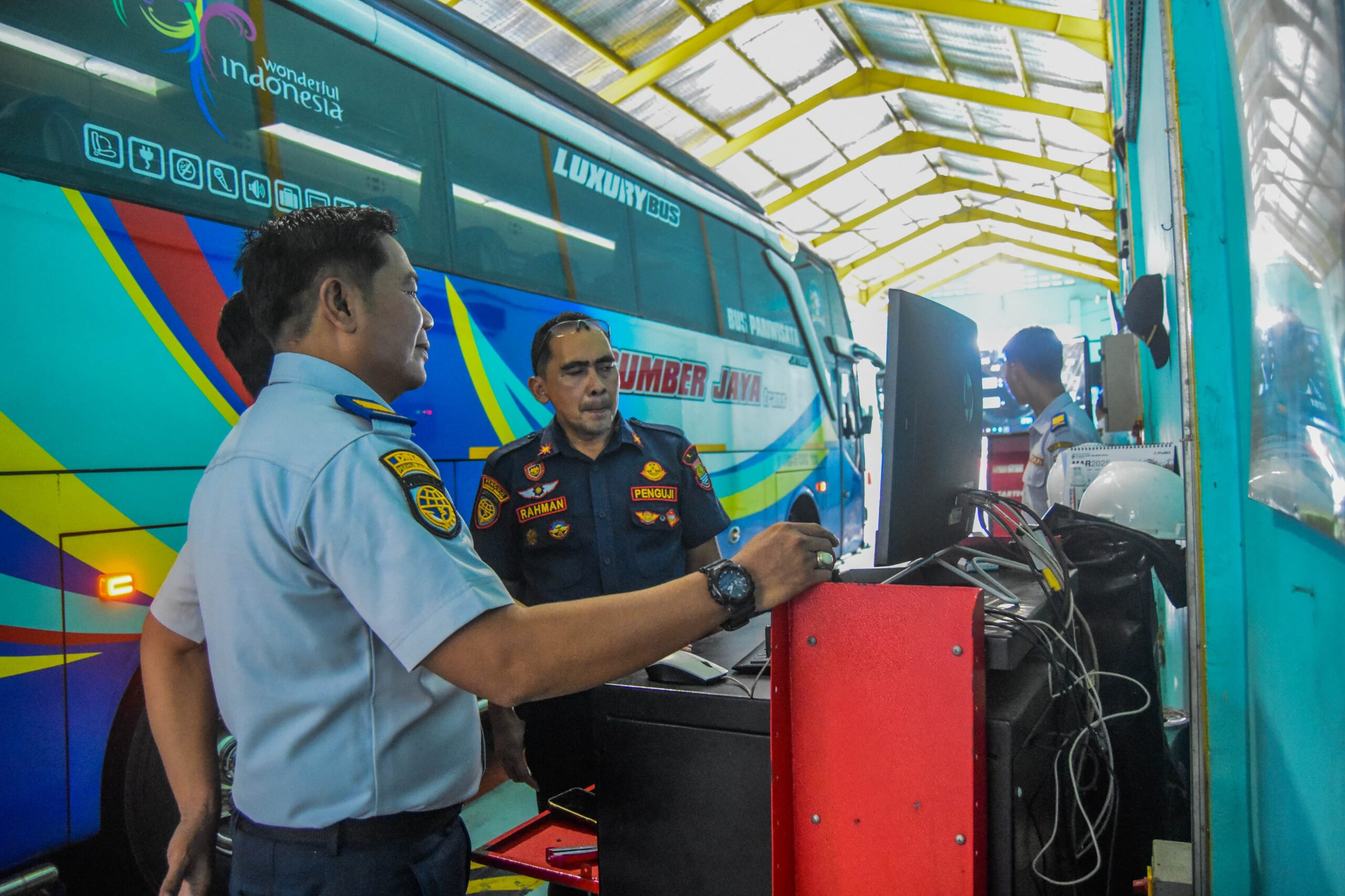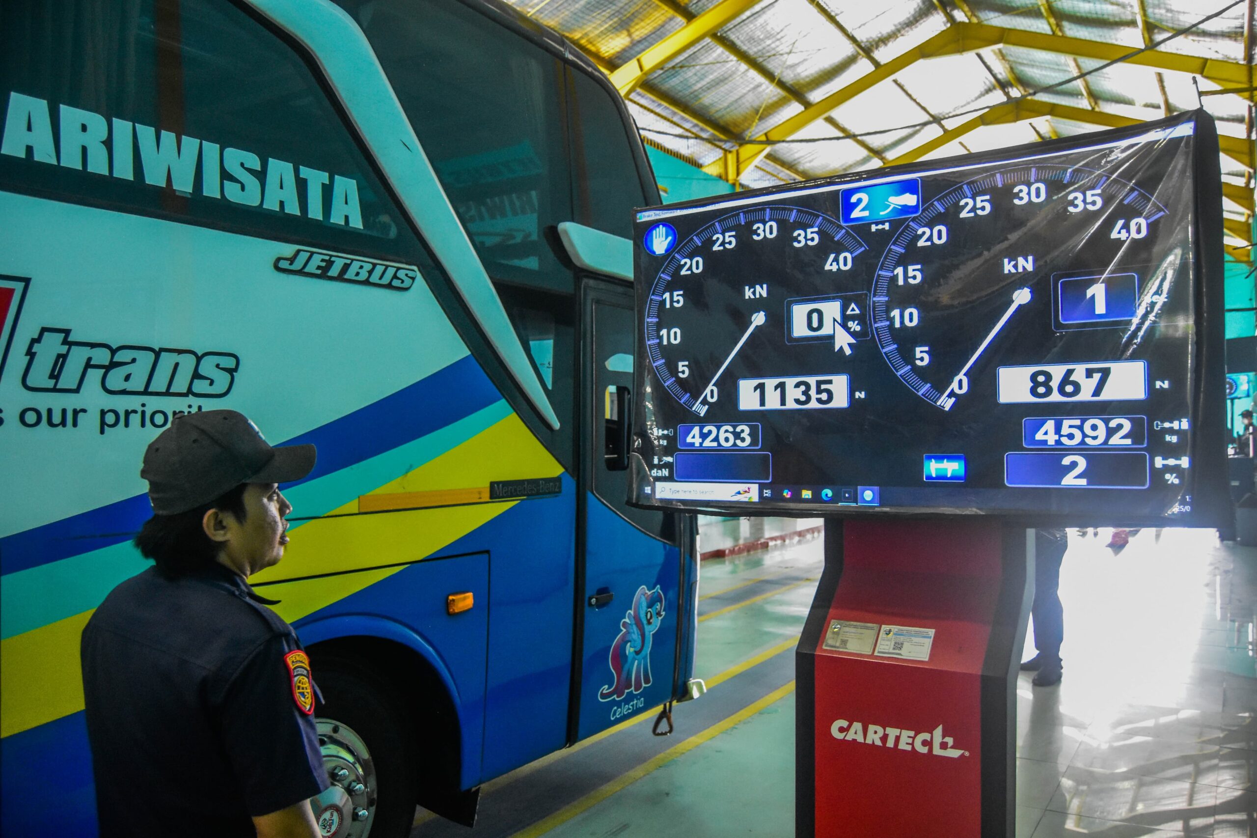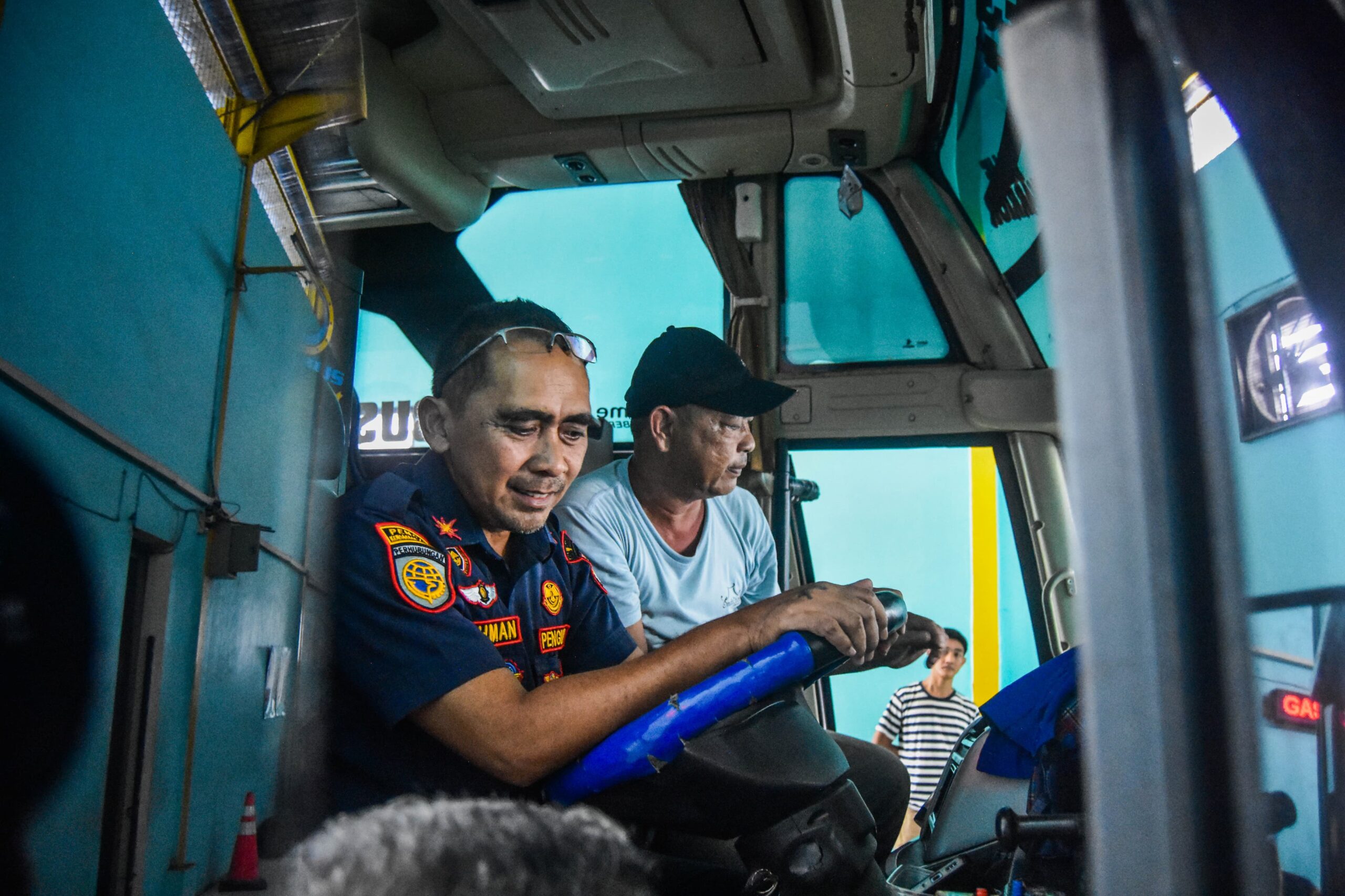 Pemerintah Kabupaten Tangerang menargetkan 64 armada bus mudik gratis lebaran 2025 dilakukan ramp chek, bertujuan untuk memastikan kendaraan yang digunakan dalam program mudik gratis memenuhi standar keselamatan dan kenyamanan para penumpang. Foto : Ilham Herda Fauzi/ LENSABANTEN