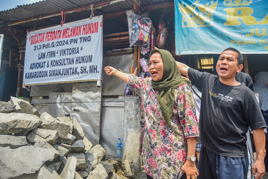 Perumda dan petugas gabungan melaksanakan penutupan dan penggusuran di Pasar Kuta Bumi untuk melakukan revilitasi pasar tersebut. Namun ada penolakan dari pedagang untuk pindah Tempat Penampungan Pasar Sementara (TPPS) yang telah disediakan pemerintah. Personil gabungan yang diturunkan dari Pol PP, Polri, dan TNI, hinga menurunkan alat berat 2 eskafator. Foto : Ilham Herda Fauzi/LENSABANTEN