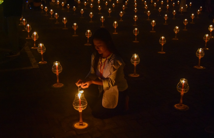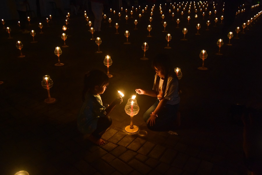 Dua orang anak menyalakan lilin dalam acara sanghadana dan Light Of Peace di Perguruan Buddhi, Kota Tangerang, Banten, Sabtu (28/12/2024) malam. Dalam acara sanghadana dan Light Of Peace adalah wujud bukti dan hormat para umat kepada sang Buddha. Sanghadana dan Light Of Peace merupakan bagian dari program Pabbajja Samanera Sementara MBMI dan sekolah perguruan Buddhi. Foto : Ilham Herda Fauzi/LENSABANTEN