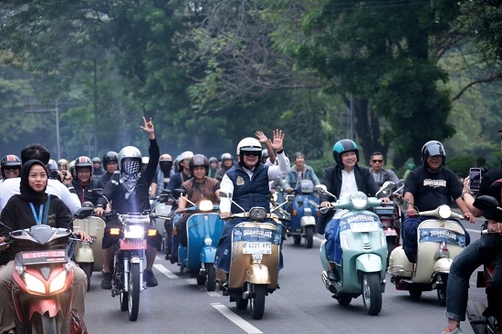 Wakil Wali Kota Tangerang, H. Maryono Hasan, ikut serta riding santai bersama ratusan scooterist yang tergabung dalam Ikatan Motor Indonesia (IMI) Kota Tangerang. Kegiatan bertajuk Scooter Sarungan ini menjadi salah satu rangkaian Festival Al-A’Zhom ke-12 tahun 2025, yang digelar pada Minggu sore (29/6/26). Mengambil rute melintasi sejumlah ruas jalan di Kota Tangerang dan berakhir di Taman Elektrik, Maryono menyampaikan apresiasi atas inisiatif IMI Kota Tangerang serta partisipasi aktif para pecinta skuter yang memeriahkan festival tahunan ini. Foto : Dok Humas Pemkot Tangerang
