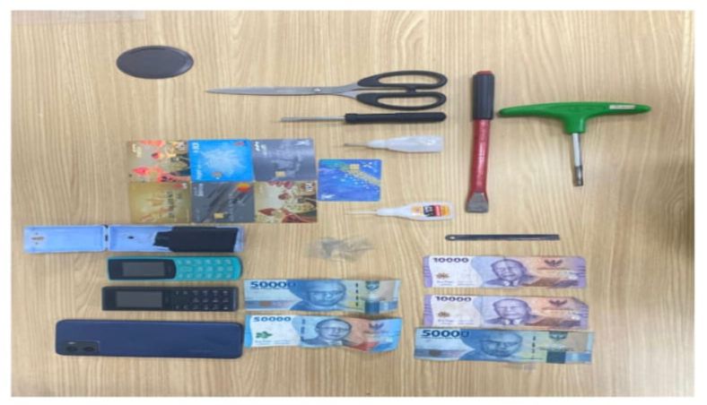 Dari tangan pelaku, polisi mengamankan sejumlah barang bukti berupa kartu ATM berbagai bank, alat ganjal berupa mika bening yang telah dimodifikasi, lem perekat, serta beberapa unit handphone.
