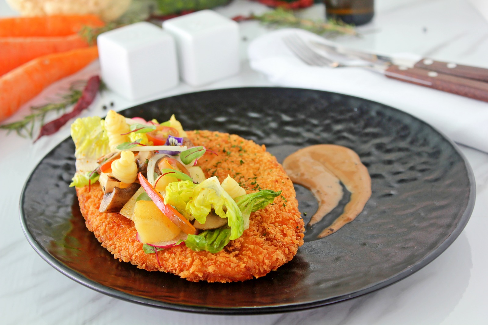 - Frittiertes Hähnchen Schnitzel – Rp 75.000 ++ per porsi: Potongan ayam yang dibalut dengan tepung roti dan digoreng hingga garing, disajikan dengan salad kentang dan saus jamur yang lezat.