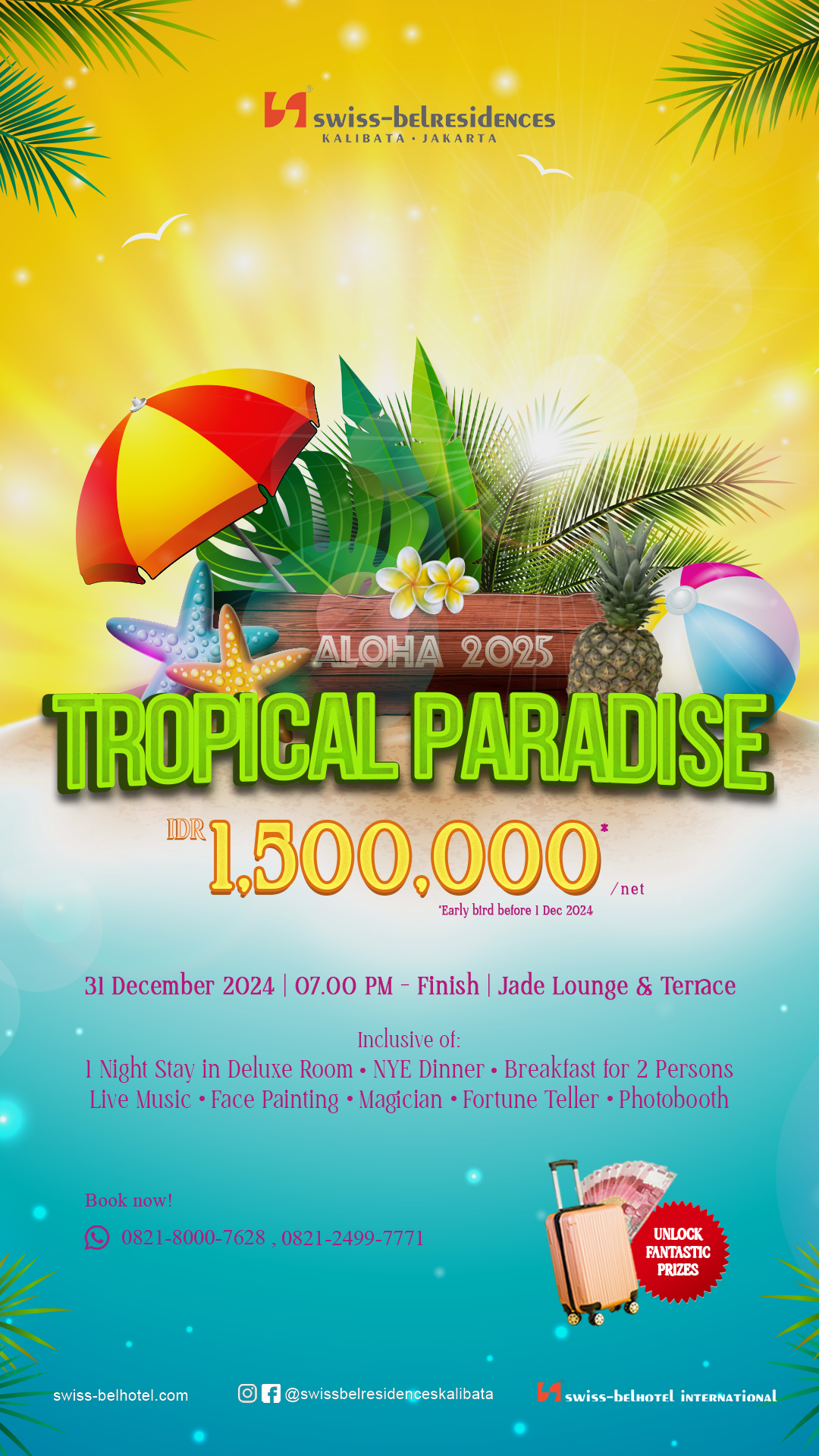 JAKARTA, LENSABANTEN.CO.ID – Di pengujung tahun 2024 ini, Swiss-Belresidences Kalibata menghadirkan acara malam pergantian tahun dengan tema “Tropical Paradise Aloha 2025” yang dikemas dengan penuh kegembiraan di aera outdoor sehingga dipastikan menjadi salah satu momen yang berkesan untuk setiap tamu yang akan merayakan pergantian tahun dalam suasana yang berbeda.