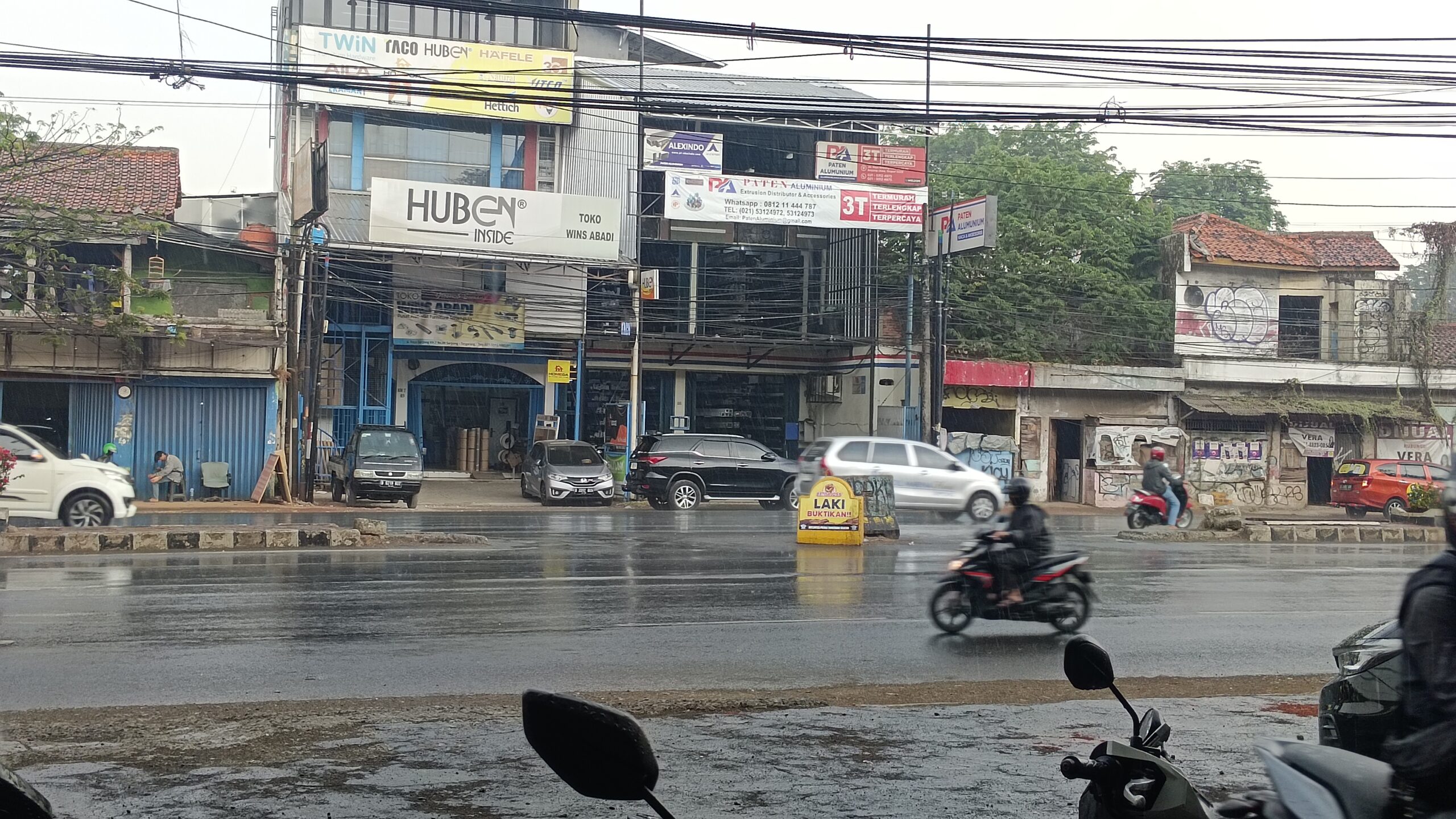 Hujan yang mulai turun pukul 13.15 WIB ini membuat pengendara roda dua menepi untuk berteduh.