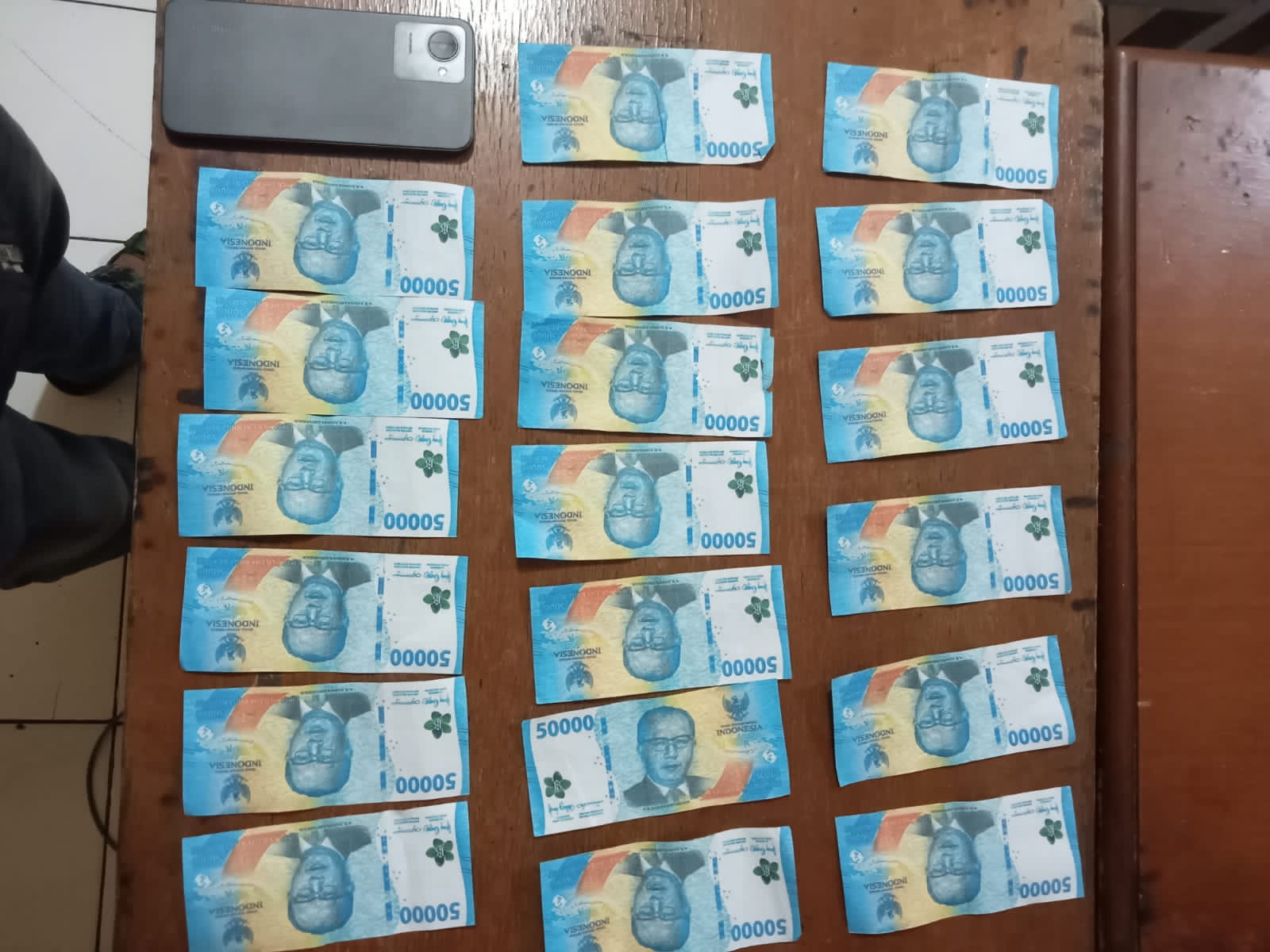 Barang bukti yang berhasil diamankan berupa uang palsu dalam pecahan Rp 50 ribu sebanyak 19 lembar. Kapolsek Ciledug, AKP Diorisha Suryo mengungkap, katanya pelaku S mendapatkan uang palsu tersebut dari seseorang hasil penjualan handphone sebelumnya.