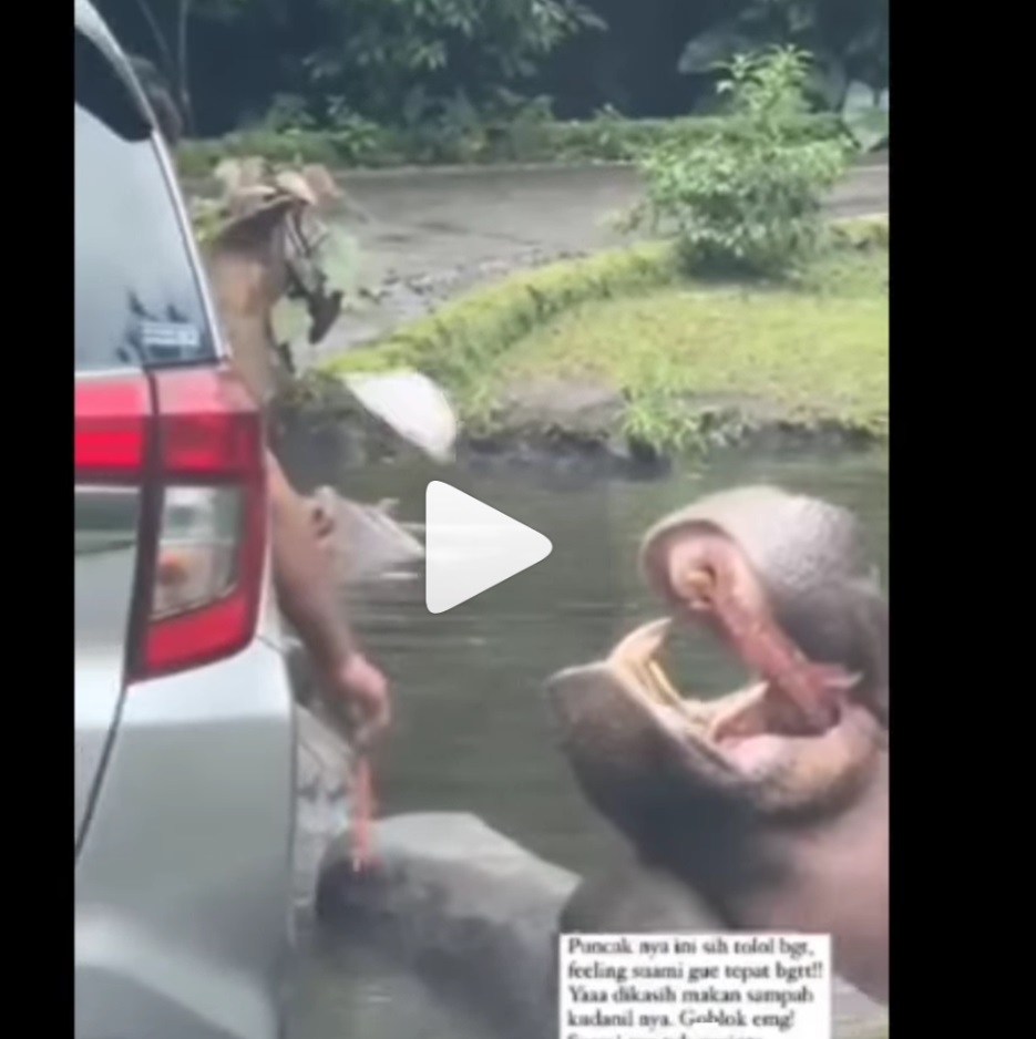 Di video, terekam kamera tangan yang memberi makan ke kuda nil yang pada saat awal belum membuka mulut dan sedang diiming-imingi makan, namun sesaat kemudian mulut kuda nil terbuka yang dalam sekejap dari dalam mobil keluar sebuah benda diduga sampah plastik yang dilemparkan ke mulut kuda nil.