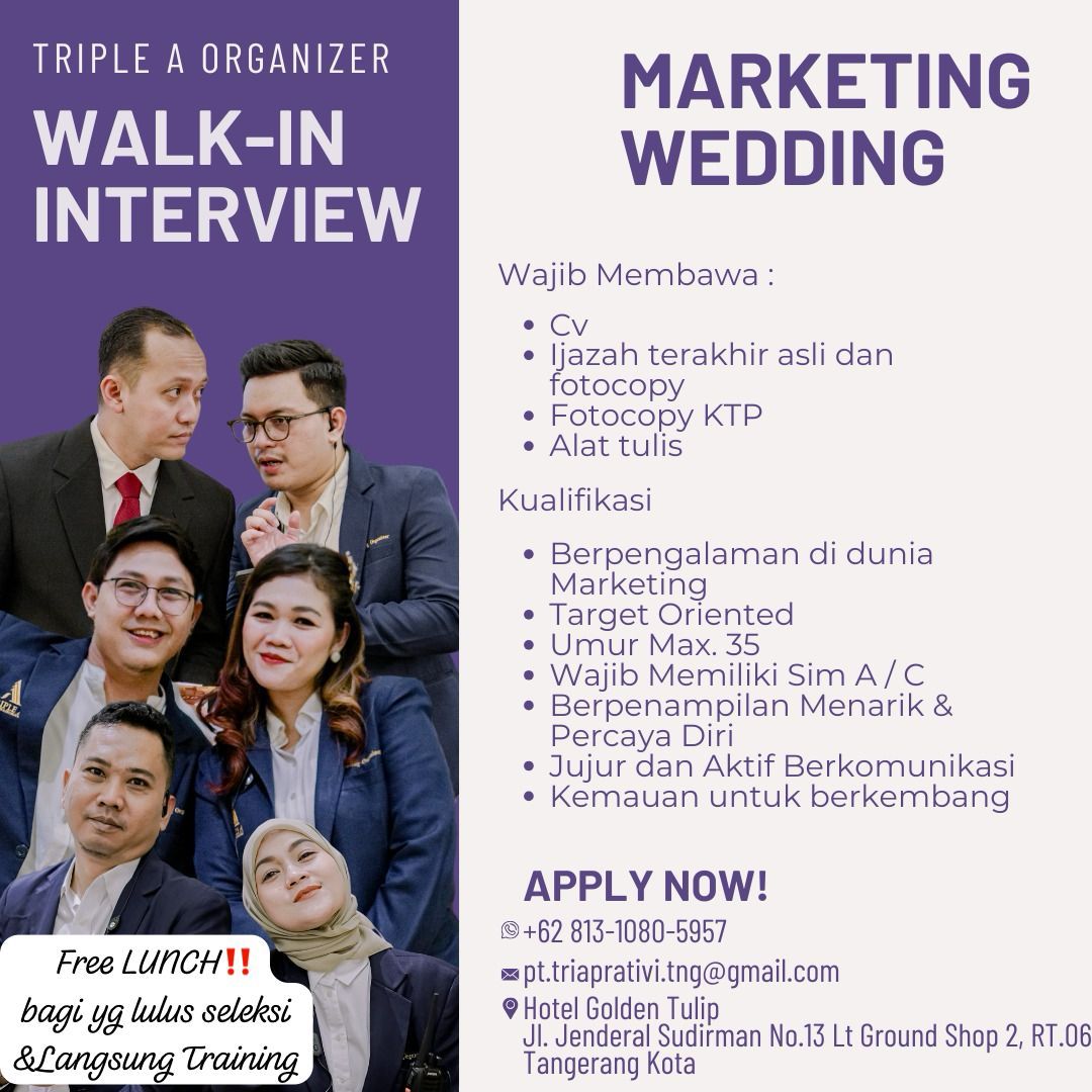 PT Tria Prativi, dengan brand Triple A Organizer, mengundang Anda untuk walk interview sebagai Marketing wedding yang di adakan :